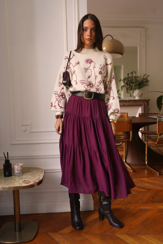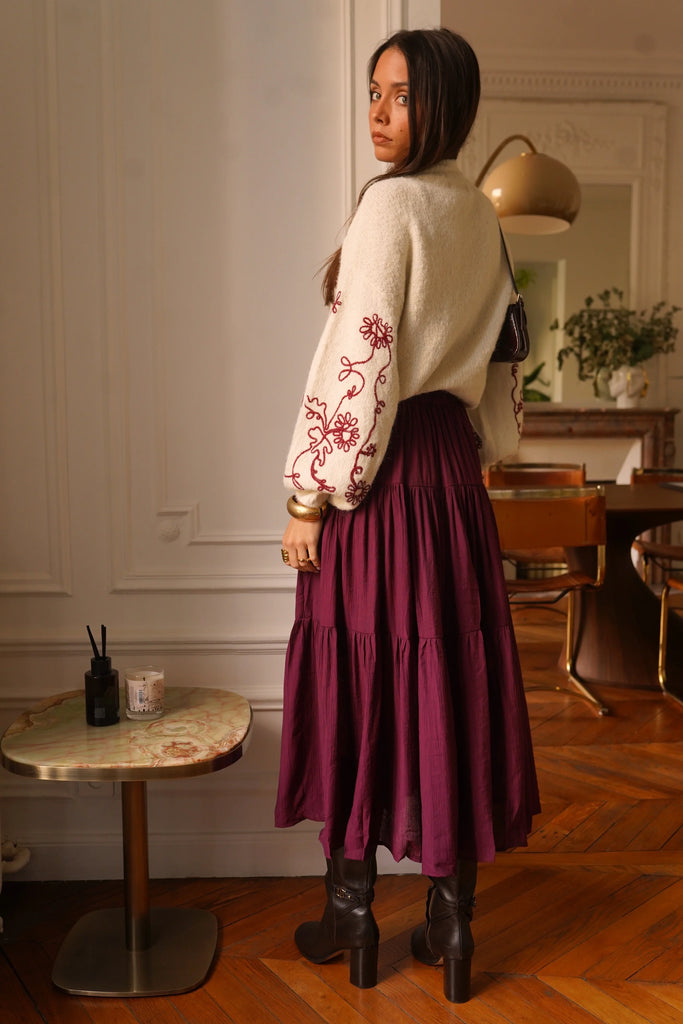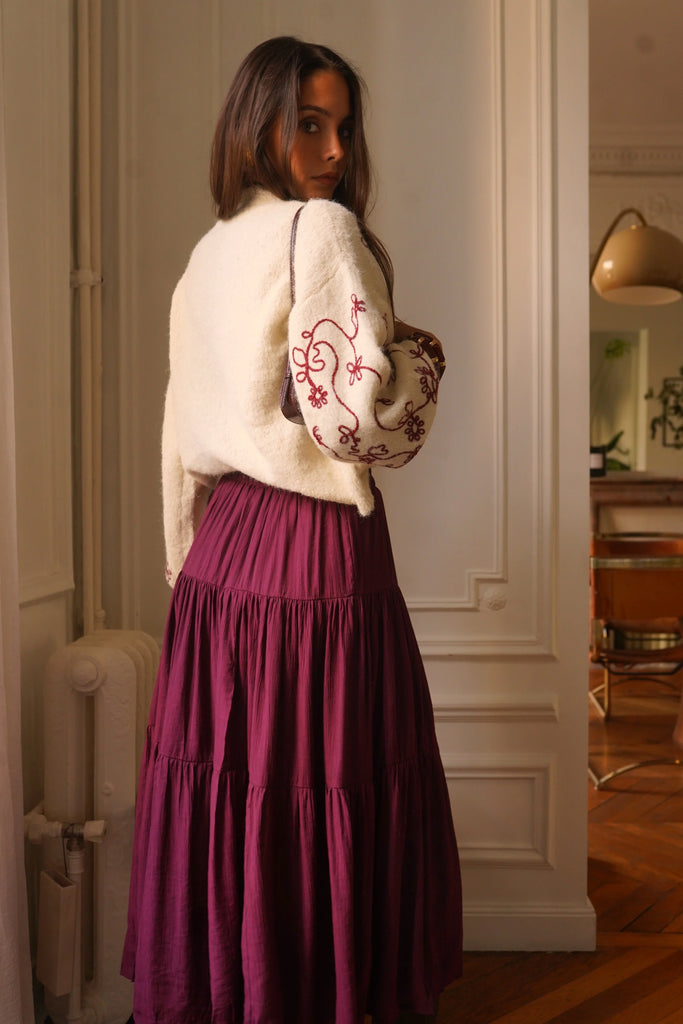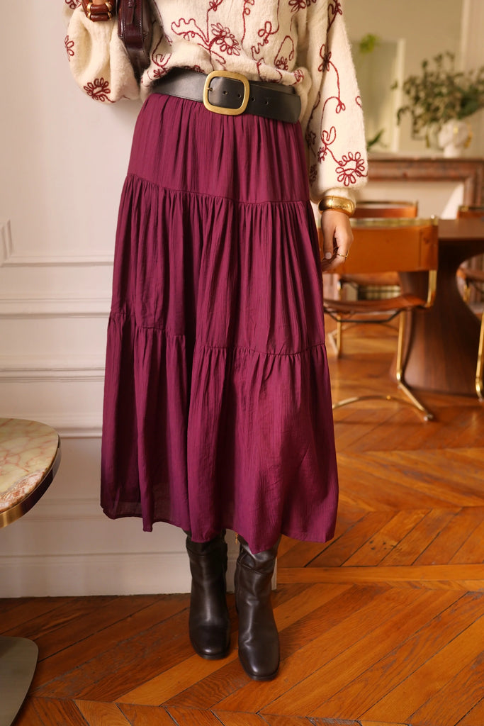 Jupe Apolline, longue, de couleur bordeaux, effet jupon.
