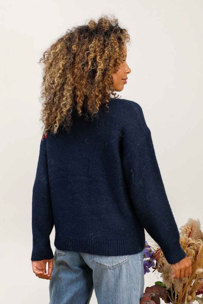 Pull bleu avec des sequins de multiples couleurs sur l'épaule gauche.