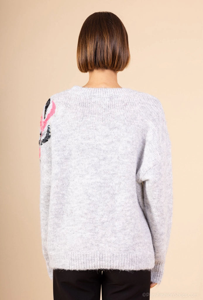 Pull gris avec des sequins de multiples couleurs sur l'épaule gauche.