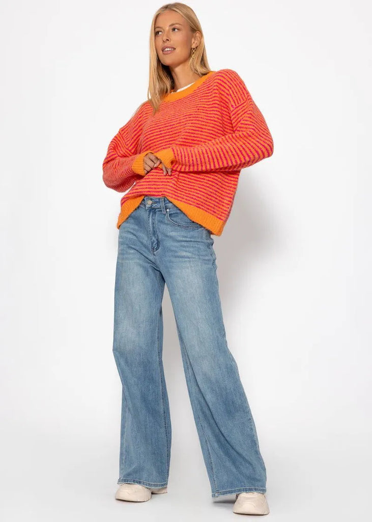 Pull avec des lignes oranges et rouges, ainsi qu'un col et le bas des manches oranges.
