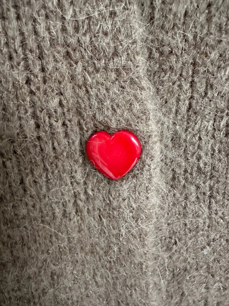 Gilet marron à manches longues avec des boutons en formes de cœurs roses, rouges et marrons.
